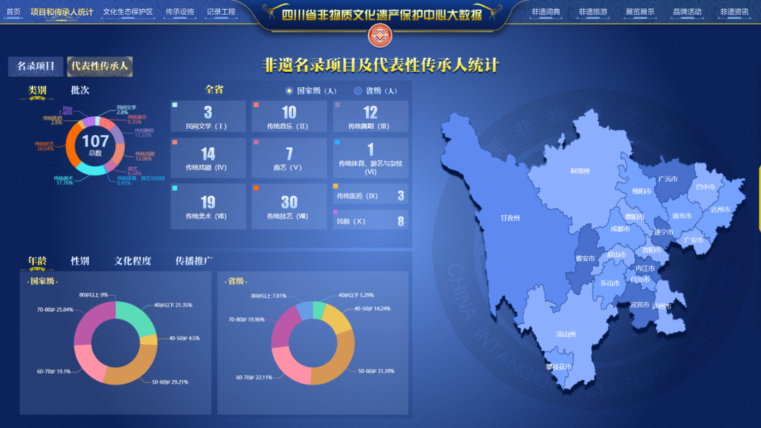 四川省非遺大數(shù)據(jù)平臺(tái)以可視化方式集中展示了四川非遺的圖文影音資源、地域分布、多維度統(tǒng)計(jì)數(shù)據(jù),包括代表性項(xiàng)目、代表性傳承人、傳承設(shè)施等基礎(chǔ)數(shù)據(jù),以及記錄工程、文化生態(tài)保護(hù)區(qū)、非遺詞典、非遺旅游、展覽展示、輿情管理等重要非遺保護(hù)工作成果。