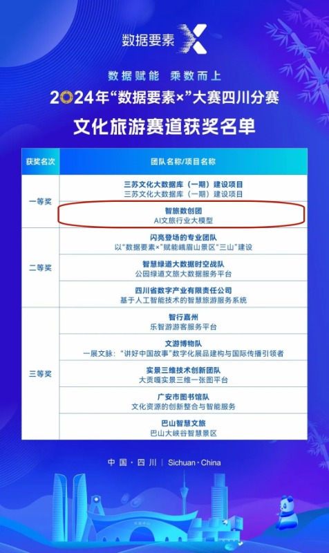 本次大賽中,川投數科(原簡稱:智勝集成)的智旅數創團憑借其研發的“AI文旅行業大模型”項目,榮獲“數據要素×”文化旅游賽道一等獎,后續將代表四川征戰全國總決賽。
